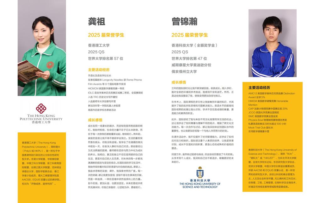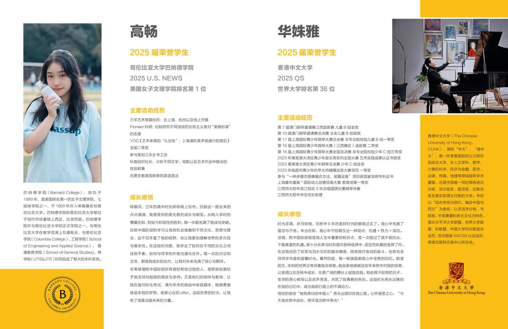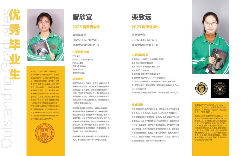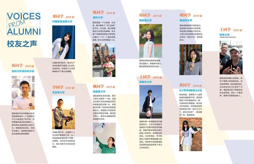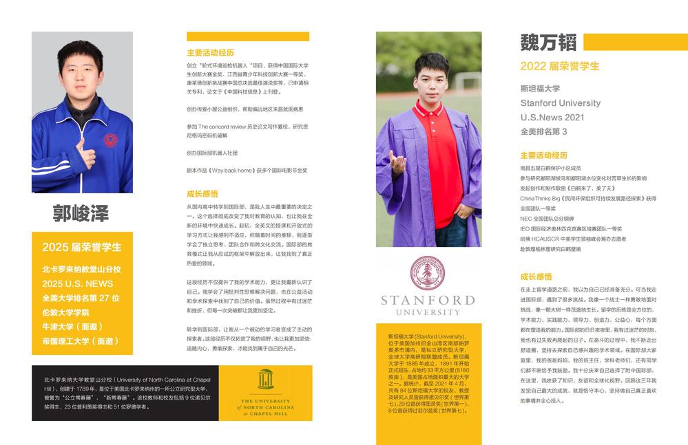 14 years of hard work have led our program to be one of the best international program in Central China. One hundred percent of our graduates have been admitted to colleges and universities abroad, not only in the United States, but also in the United Kingdom, Canada, Australia and Hongkong, China. Half of our students have been accepted by top-ranking universities, including the Stanford University, Cornell University, University of Chicago, Johns Hopkins University, Northwestern University, Vanderbilt University, Emory University, Carnegie Mellon University, Imperial College London, UCL, KCL, the University of Edinburgh, the University of Manchester, the University of Toronto, McGill University, UBC, the University of Sydney, the University of Melbourne, National University of Singapore, HKUST, CUHK and PolyU, etc. From 2019 to 2022, two of our excellent graduates were accepted and admitted by Stanford University. In the Early Decision round of 2024, another outstanding student received an offer from Cornell University. Over the past five years, the admission rate of our graduates into the top 50 universities in the United States has risen to 89.5%. The admission rate of the class of 2022 graduates of the top 63 universities in the United States has reached 100%; the admission rate of our students into the top 30 universities in the United States has reached 23%. The school enjoys an excellent international reputation and endorsement in terms of college enrollments.